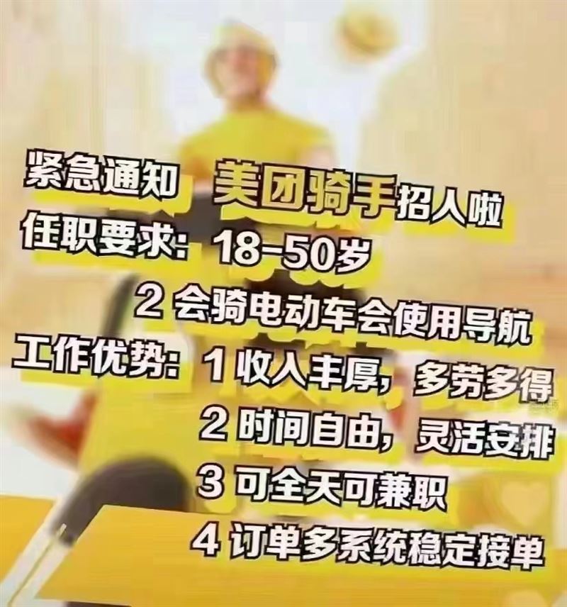 入職要求:18-55周歲會騎電動車會看導航?jīng)]有案底即可入職
